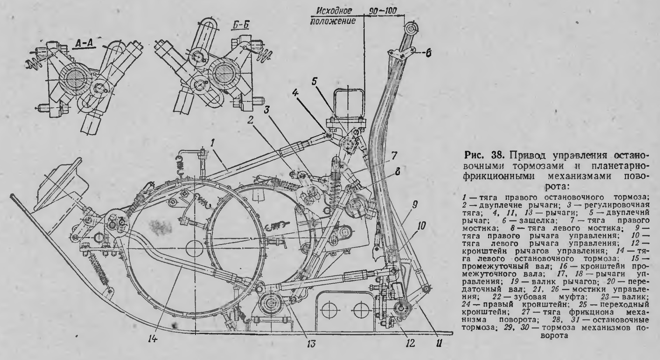 When the steering levers are in the initial or '0' position, the steering clutches are engaged, and the steering brakes are disengaged. In this condition, the steering inputs convey power to the steering units. In the '1' position, the steering clutch is disengaged and the steering brake is engaged. In the '2' position, the steering clutch remains disengaged, but the steering brake is disengaged, and then the stopping brake is engaged. For this behaviour to be possible, the steering clutches and brakes are regulated by a control mechanism, one for each set of steering inputs. When a steering lever is pulled back, it does not directly tighten the brake bands or pull the clutch plate, but rather, pushes upon camming surfaces under spring tension to manipulate the cranks for the clutch and brake in discrete steps. Due to the small forces involved in controlling these modules, which in turn is due to the light weight of the MT-LB, the steering levers require little effort despite the lack of power assist.